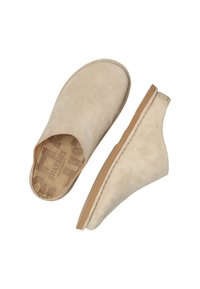 Chaussure beige en daim à enfiler avec une texture lisse, bout arrondi et semelle en caoutchouc cousue. Design minimaliste avec une étiquette logo à l'arrière.