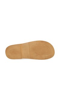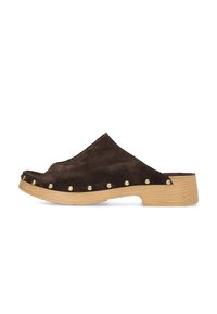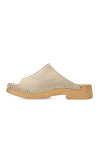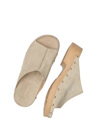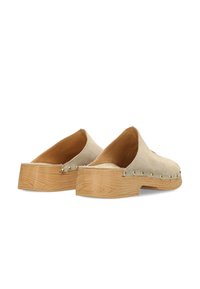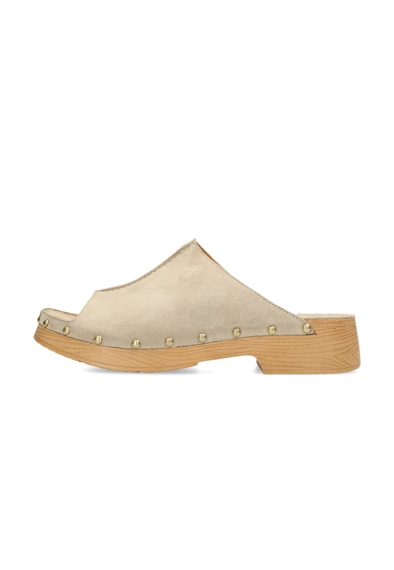 Sabots en daim beige avec un dos ouvert, une plateforme en bois et des clous dorés décoratifs le long du bord supérieur. Texture lisse et forme arrondie.
