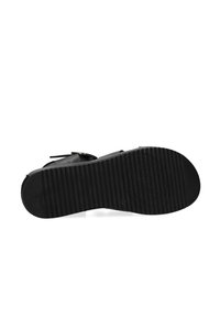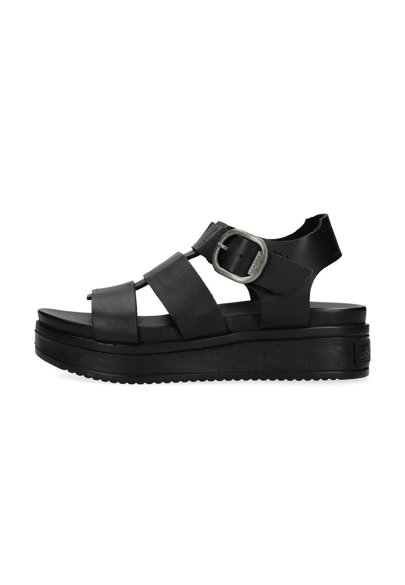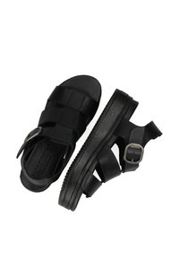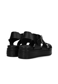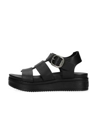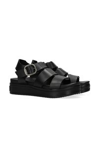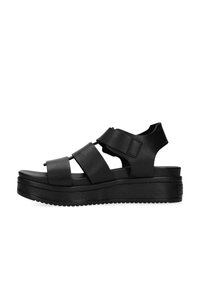 Sandales à plateforme noires avec larges brides en cuir, une boucle latérale et une semelle texturée antidérapante. Design épuré et minimaliste avec un dos ouvert.