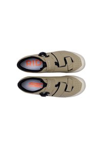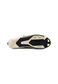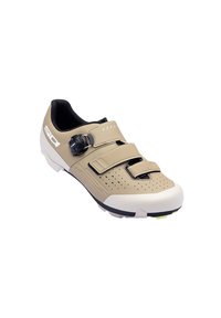 Chaussure de cyclisme beige et blanche avec une semelle en caoutchouc, dotée d'une double bride Velcro, d'une tige en cuir perforé et d'un cadran réglable.