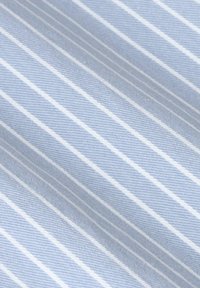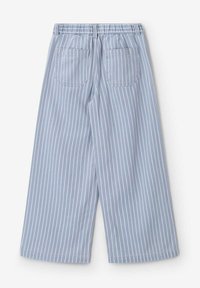 Pantalon large bleu clair à rayures verticales blanches, avec poches avant, passants pour ceinture et fermeture par bouton sur fond blanc.