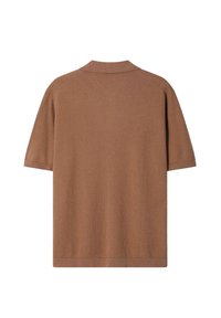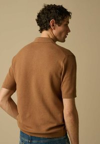 Jeune homme ajustant l'ourlet d'un polo en maille marron à manches courtes, portant un jean bleu, sur un fond beige uni.