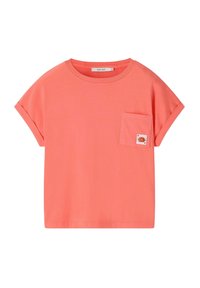 T-shirt corail à manches courtes avec revers roulés et petite poche poitrine avec une carte à jouer représentant un cœur et un poisson.