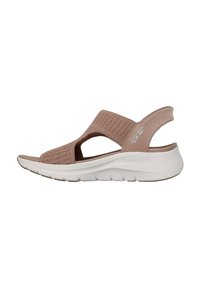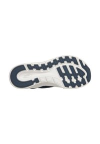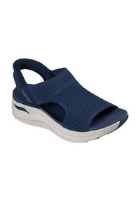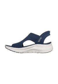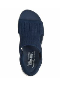 Sandale Skechers bleu marine à enfiler avec dessus en maille, orteils et talon ouverts, et semelle épaisse blanche rembourrée.