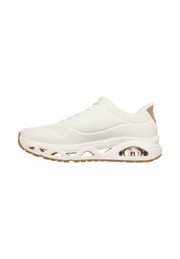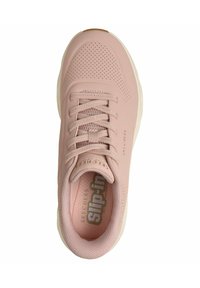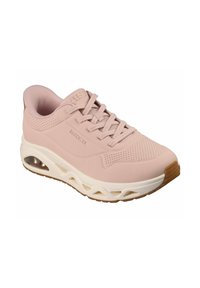 Baskets rose clair avec empeigne perforée, semelle intermédiaire blanche avec design ajouré et coussin d'air visible, ainsi que semelle extérieure en caoutchouc marron.