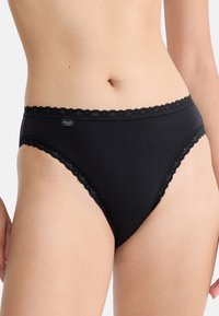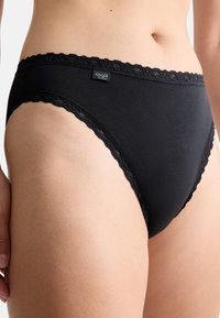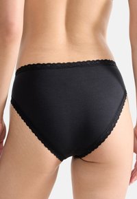 Bralette noire en tissu lisse, design à encolure en V et larges bretelles, assortie à un slip taille haute noir avec une bordure en dentelle à la taille.