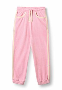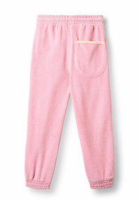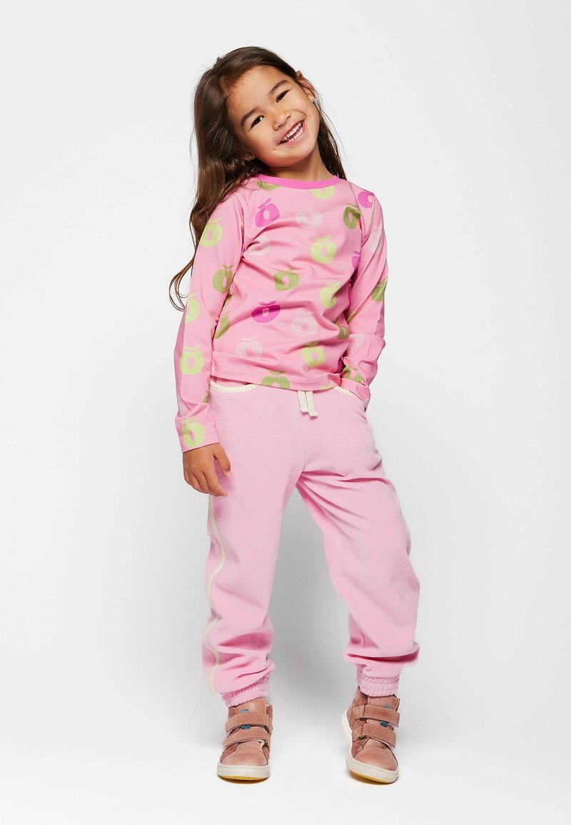 Chemise rose à manches longues avec des imprimés de pommes vertes et roses, assortie à un pantalon de jogging rose avec des poignets élastiques et une taille à cordon.