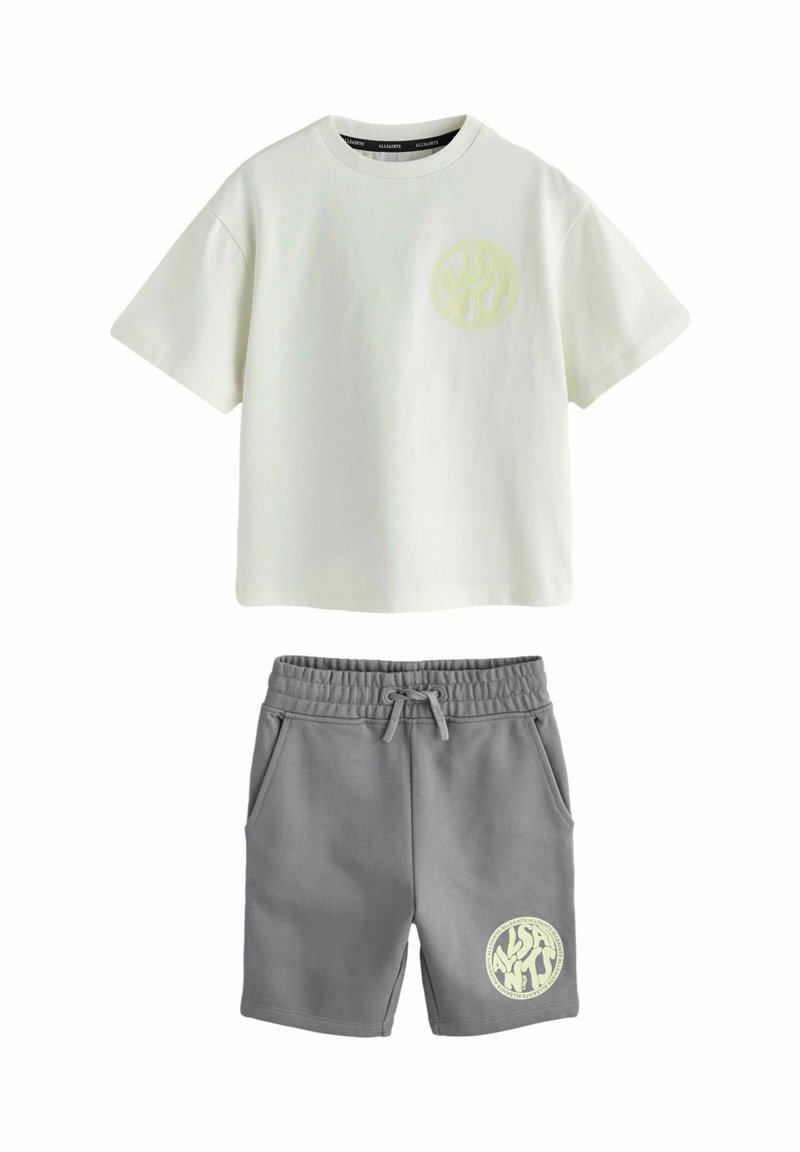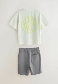 T-shirt à manches courtes écru avec col rond et short gris à cordon de serrage, tous deux ornés d'un petit logo circulaire jaune.