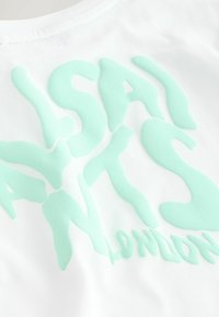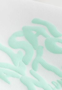 T-shirt en coton blanc à manches courtes, avec un logo texturé vert menthe sur le côté gauche de la poitrine et un col rond noir.