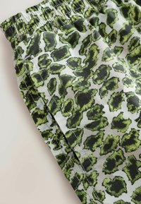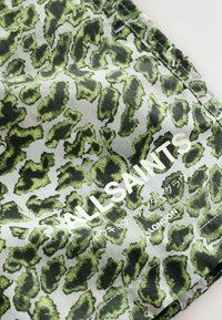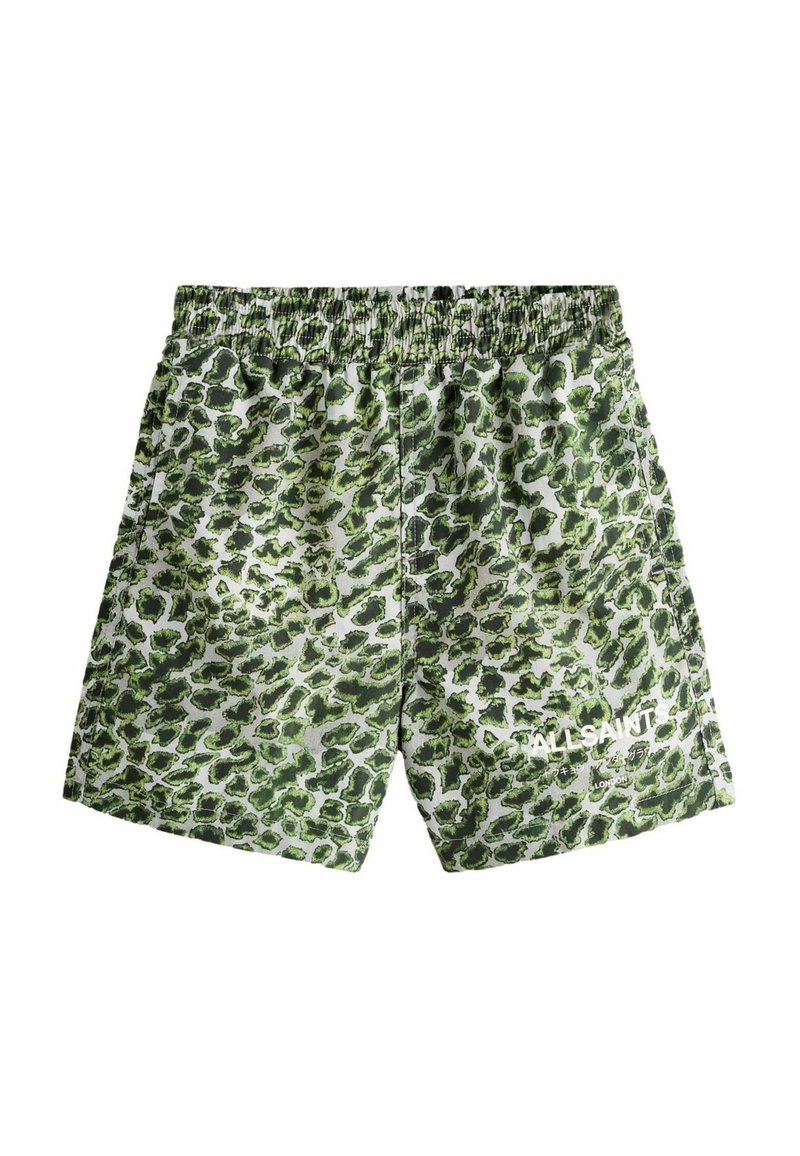 Shorts imprimé léopard vert et noir avec taille élastique, poches latérales et logo blanc « AllSaints London » sur la jambe gauche.