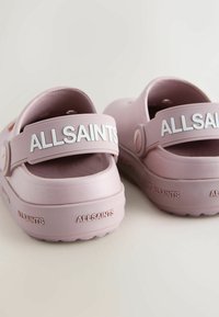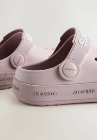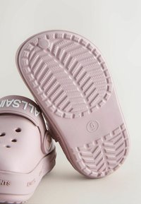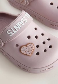 Sabot en caoutchouc rose avec des découpes circulaires, une bride arrière réglable et une surface texturée. Présente un détail en forme de cœur en relief à l'avant.