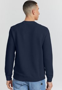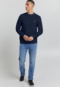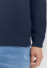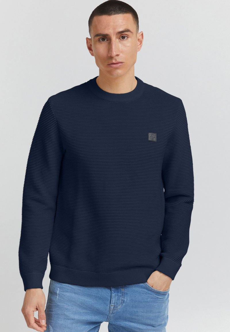 Homme portant un pull bleu marine texturé avec des poignets et un ourlet côtelés, associé à un jean bleu clair, debout devant un fond uni.