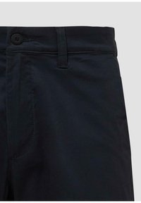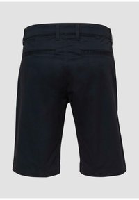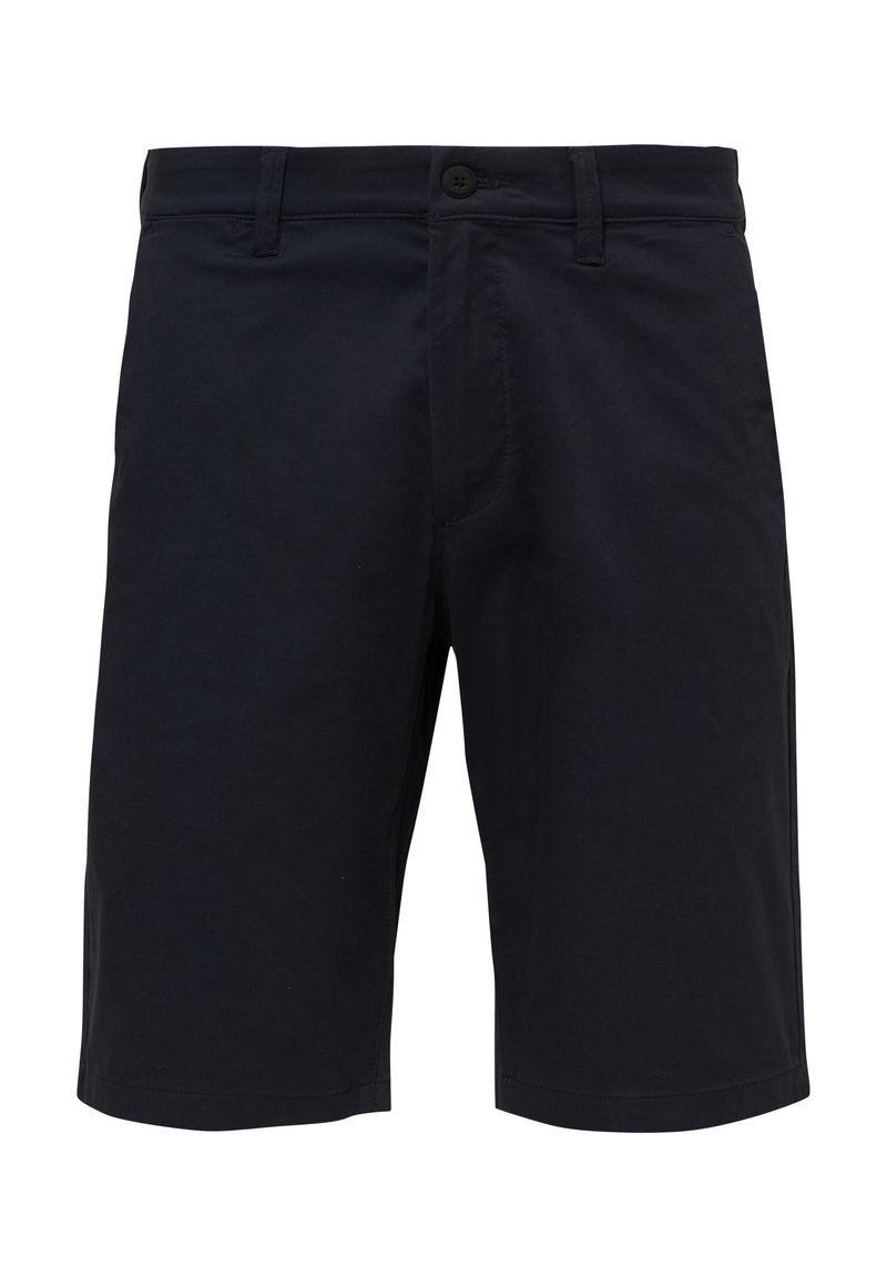 Shorts noirs à genoux avec passants pour ceinture, fermeture par bouton, et un design net et ajusté.