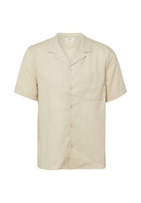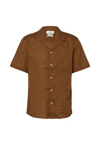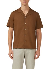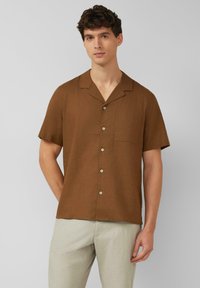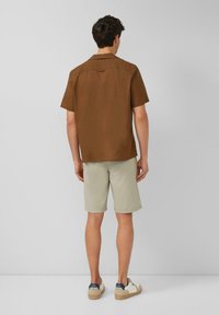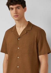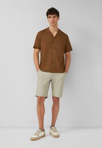 Jeune homme aux cheveux courts et bouclés portant une chemise marron à manches courtes boutonnée et un pantalon beige clair sur un fond gris.
