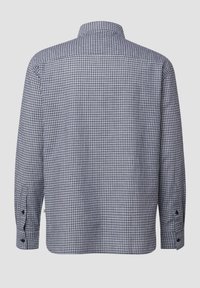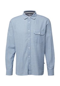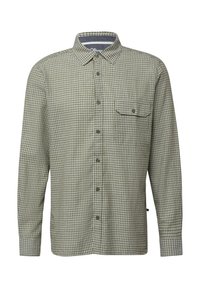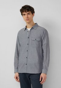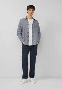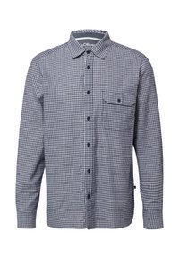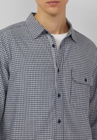 Jeune homme portant une chemise à carreaux noire et blanche sur un t-shirt blanc, debout devant un fond uni gris clair.