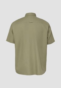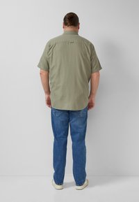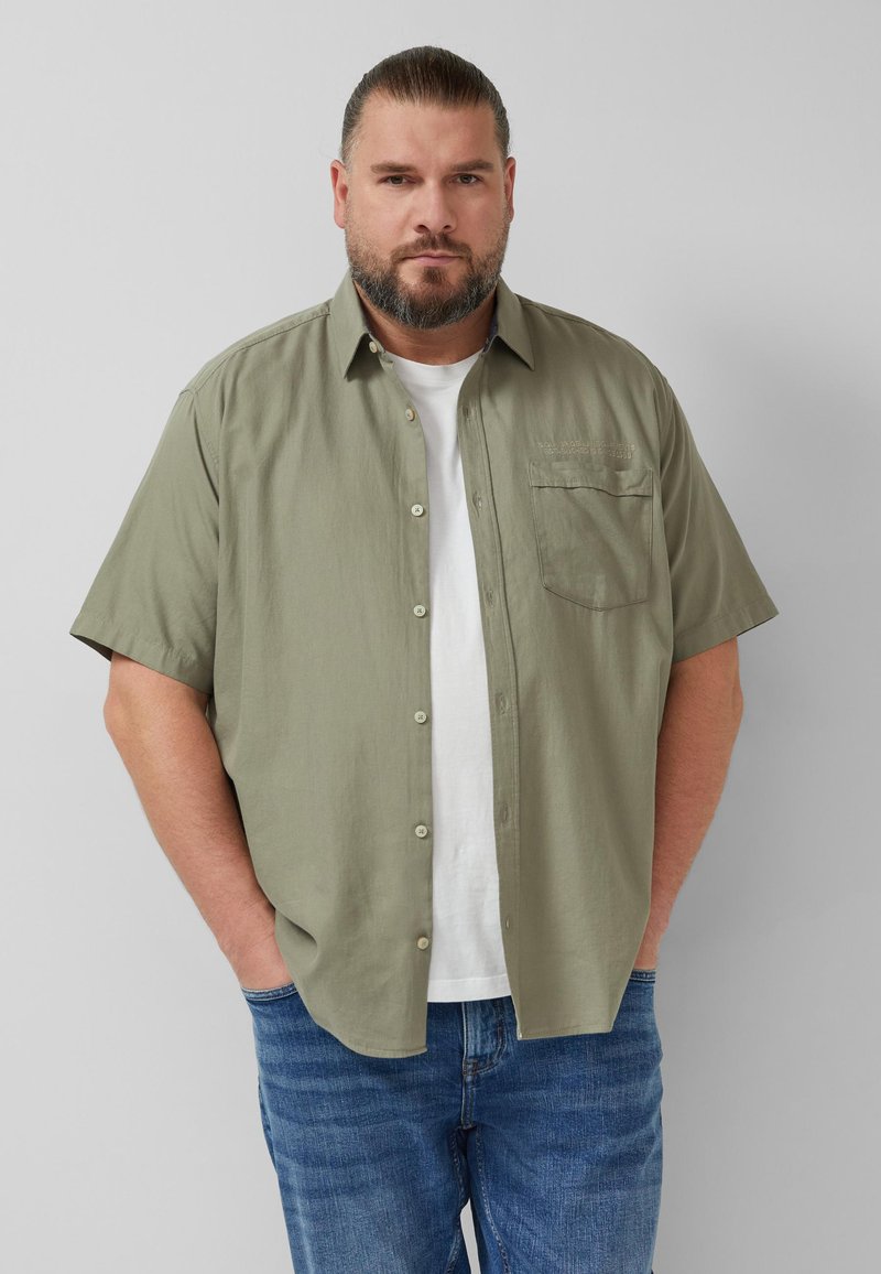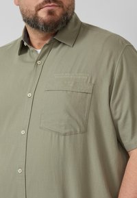 Homme avec barbe portant une chemise olive à manches courtes boutonnée sur un t-shirt blanc et un jean bleu, debout les mains dans les poches contre un mur gris.
