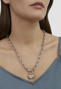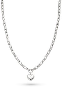 Collier chaîne en argent avec de grands maillons ovales et un pendentif en forme de cœur, posé sur un haut gris à fines bretelles.