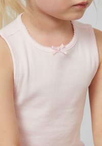 Jeune fille aux cheveux blonds portant un haut rose sans manches, un pantalon fleuri et des baskets blanches, debout contre un mur gris avec les mains sur les hanches.
