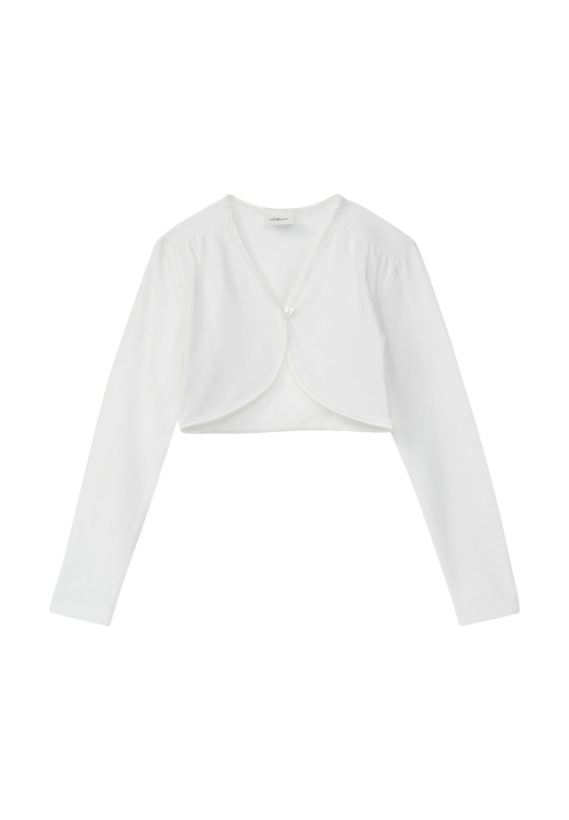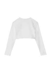 Haut blanc court à manches longues, avec un col rond et une fermeture frontale ornée d’un petit bouton. Fabriqué en tissu doux et lisse.