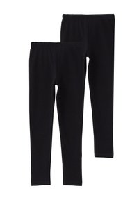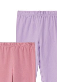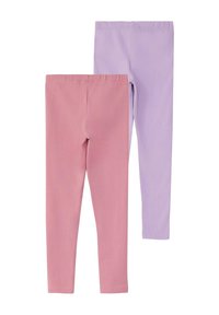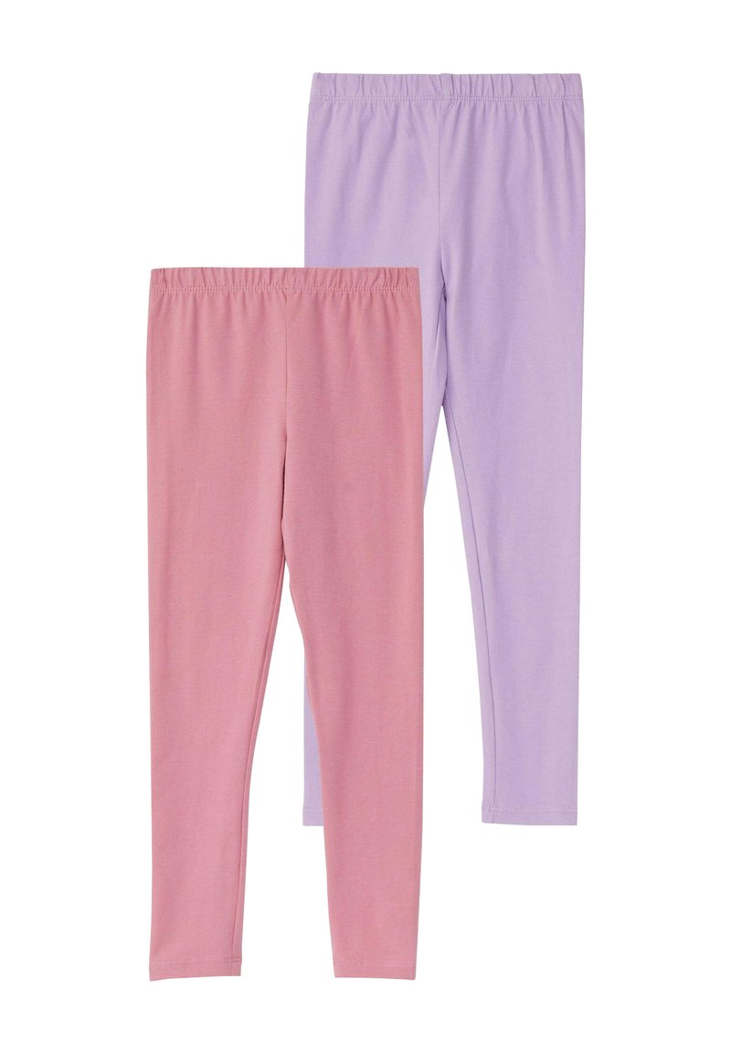 Deux paires de leggings à taille élastique simple, l'une en rose poudré et l'autre en lavande, présentées côte à côte sur un fond blanc.