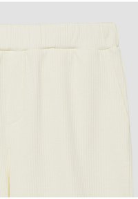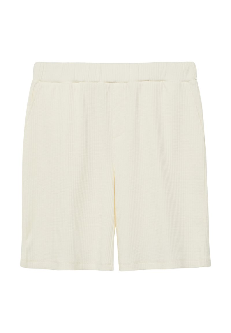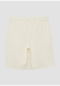 Shorts en maille couleur crème avec une taille élastique et des poches latérales, présentés à plat sur un fond blanc.