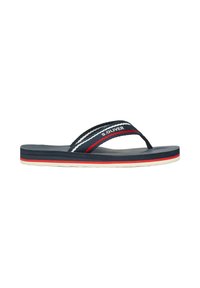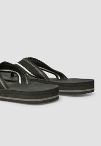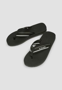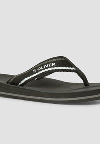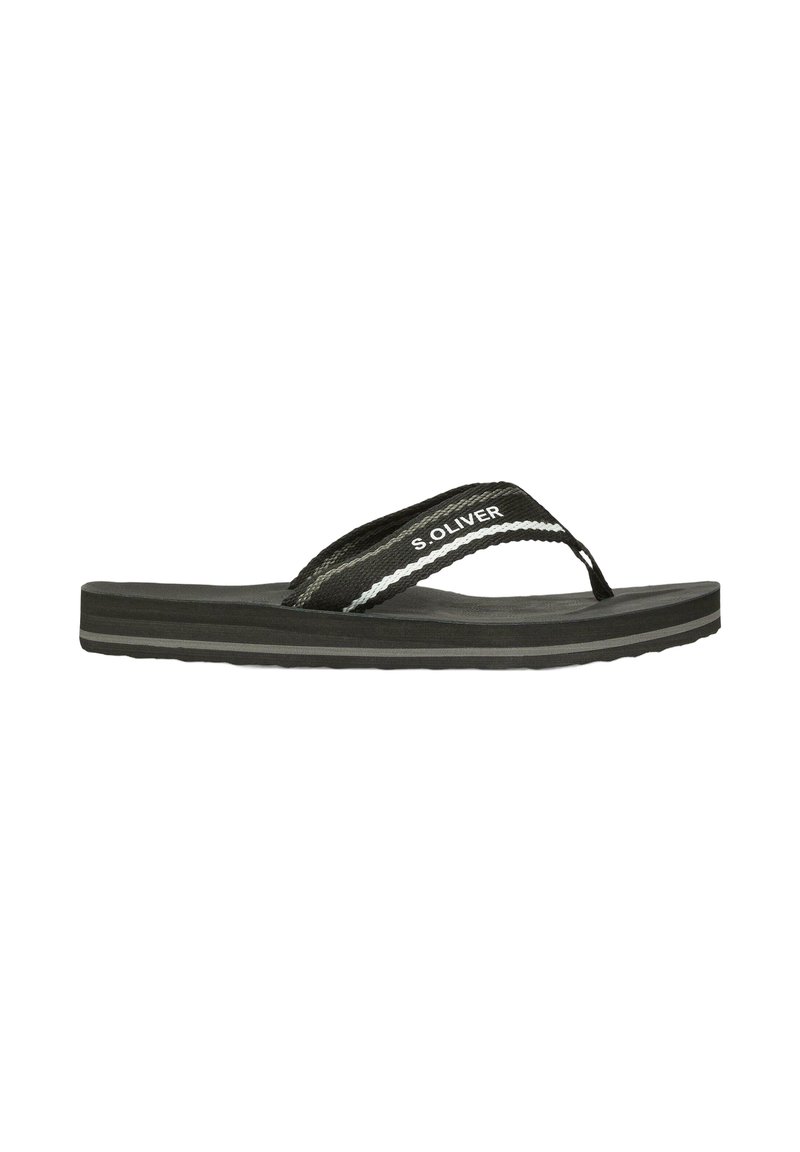 Sandale flip-flop noire avec des brides en tissu rayées gris et blanc et le logo "S. OLIVER" sur la bride latérale.