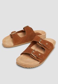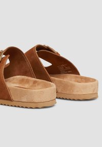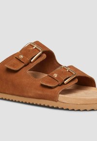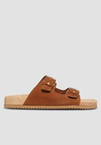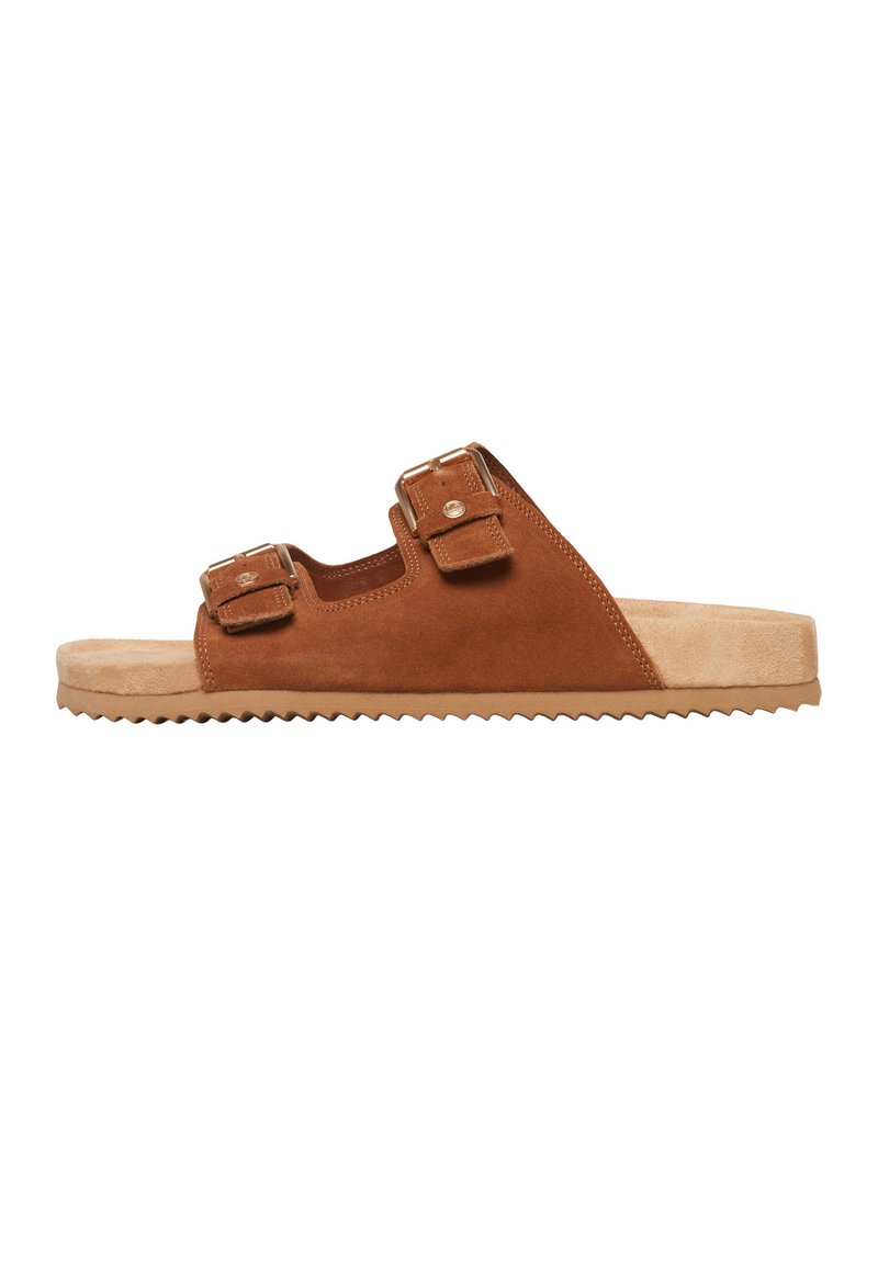 Sandale à glissière en daim marron avec deux boucles réglables et une semelle en caoutchouc rainurée pour l'adhérence, vue de côté.