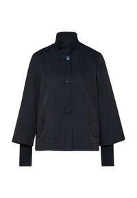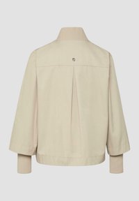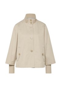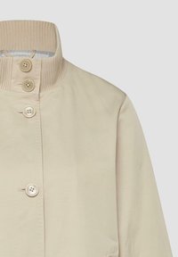 Veste beige boutonnée avec col montant, deux poches avant à rabat avec boutons, et poignets en tricot côtelé s'étendant des manches.
