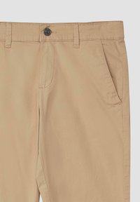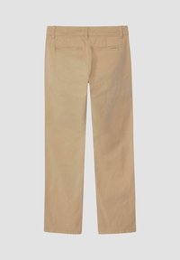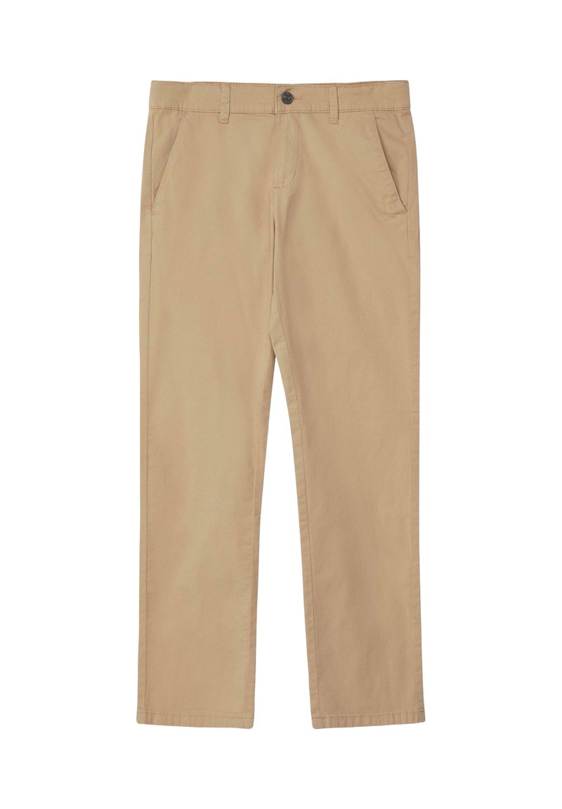 Pantalon beige en tissu lisse avec deux poches avant, une fermeture à bouton et une coupe droite. Sans motifs ni ornements.