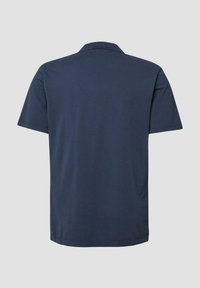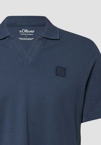 Polo bleu marine à manches courtes avec col en V et petit logo carré brodé sur la poitrine.