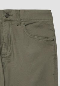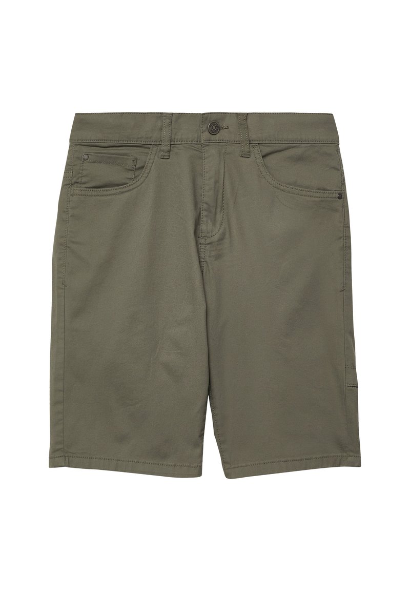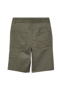 Shorts mi-longueur couleur vert olive avec passants pour ceinture, fermeture à boutons, poches avant et coutures visibles sur fond blanc.