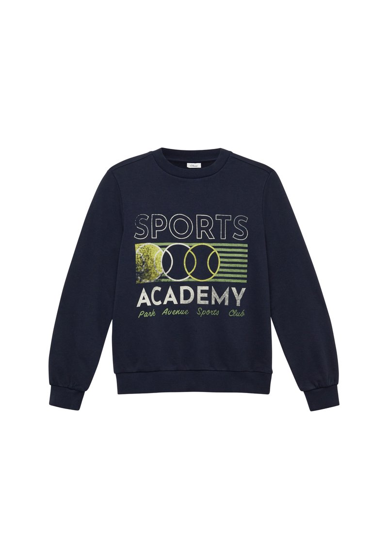 Sweat-shirt à manches longues bleu marine avec texte "Sports Academy Park Avenue Sports Club" et graphique de cercles superposés à l'avant.
