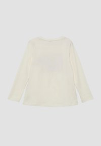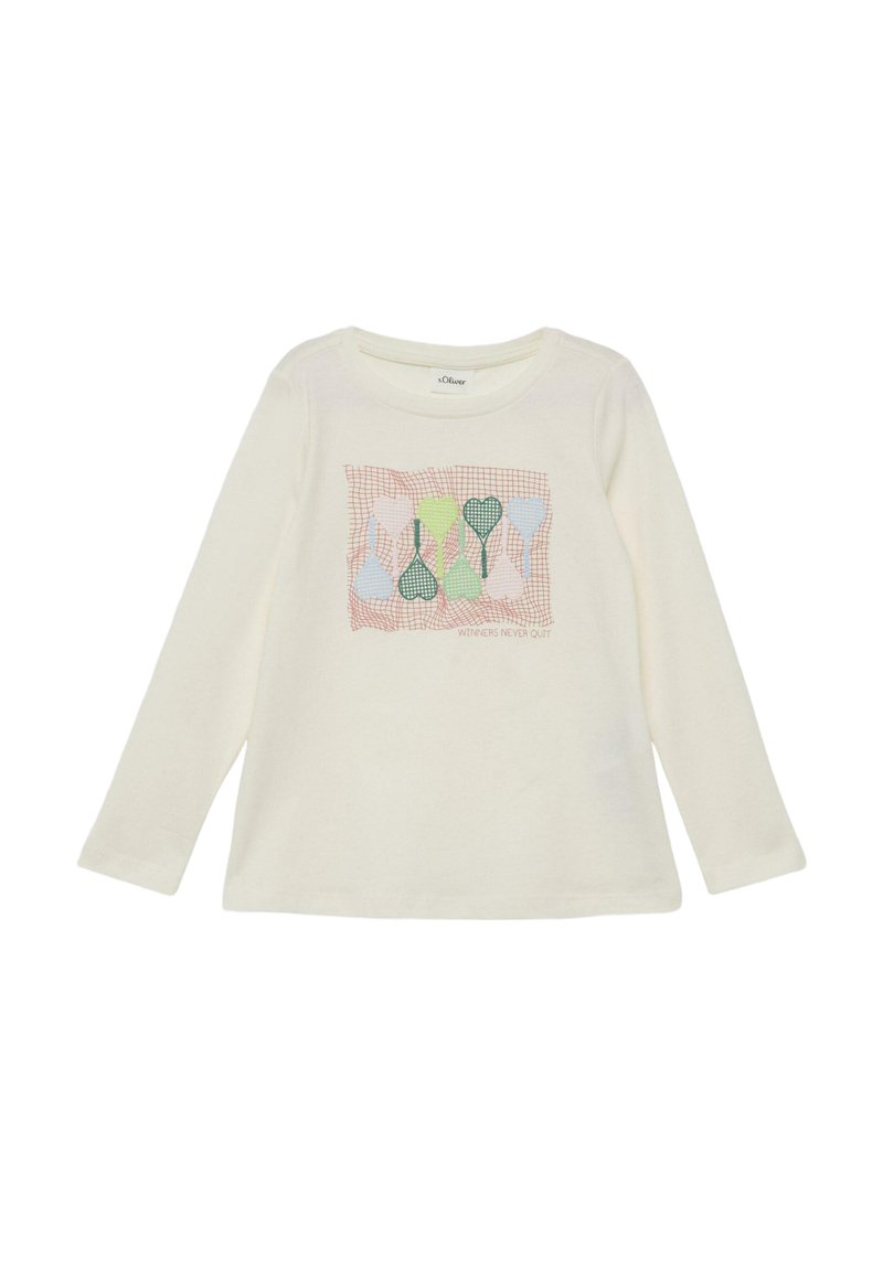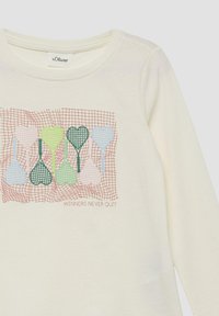 Chemise à manches longues crème avec un graphisme de raquettes de tennis vertes et bleues sur une grille rouge, avec le texte « LES GAGNANTS N'ABANDONNENT JAMAIS » en dessous.