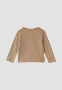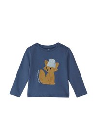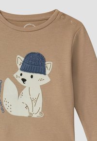 Chemise beige à manches longues en coton doux, ornée d'un renard blanc imprimé portant un chapeau tricoté bleu avec des accents dans le design.