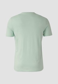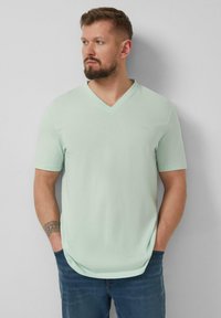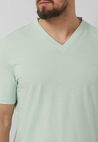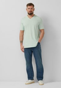 Homme barbu portant un t-shirt vert clair à col en V et manches courtes, jeans bleus, les mains dans les poches, regardant vers la gauche sur un fond uni.