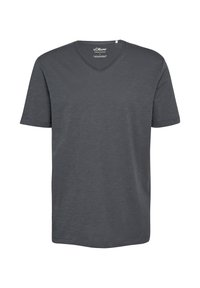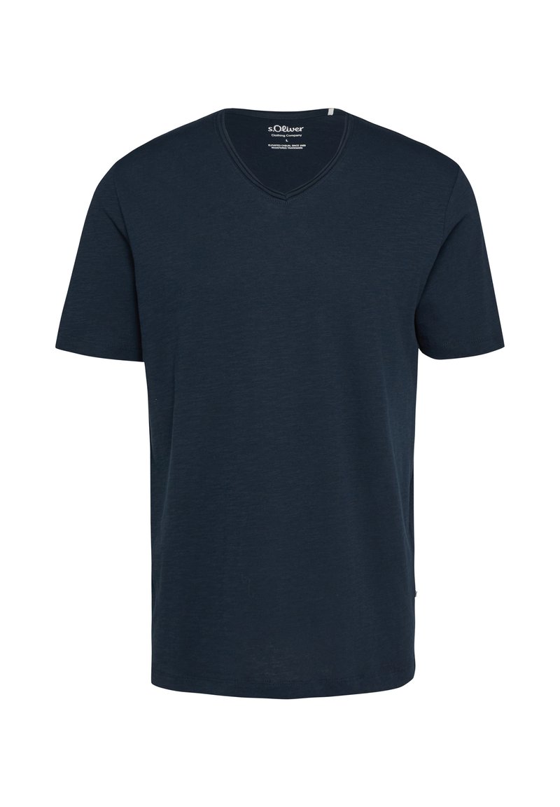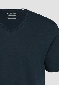 T-shirt bleu marine foncé à manches courtes et col en V avec marquage s.Oliver à l'intérieur du col, design uni, présenté sur fond blanc.