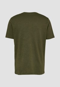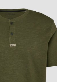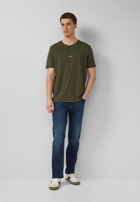 Jeune homme aux cheveux courts et bouclés portant un t-shirt henley à manches courtes vert olive et un jean bleu, debout les mains dans les poches.