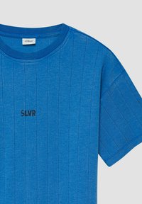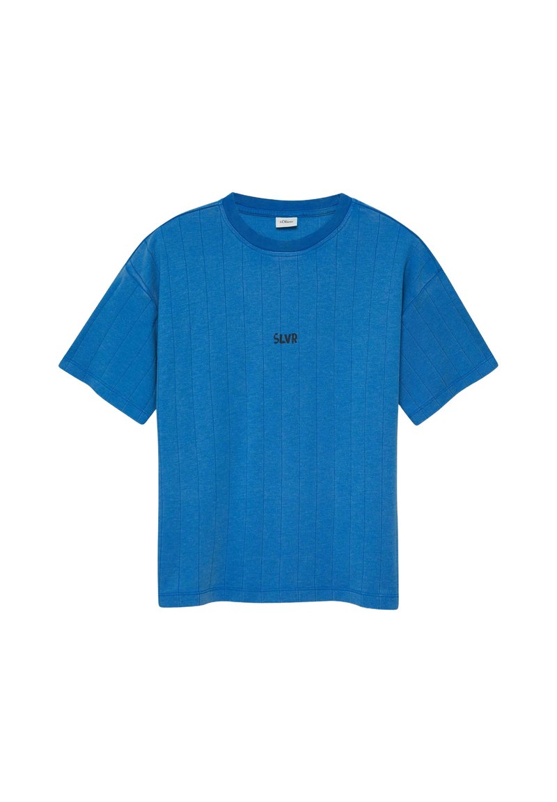 T-shirt côtelé bleu à manches courtes avec col rond et petit texte noir "SLVR" centré sur la poitrine.