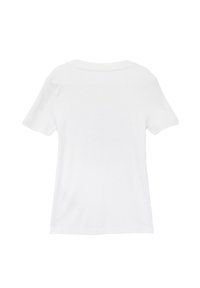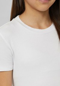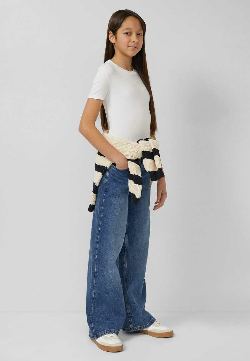 Fille aux longs cheveux bruns portant un t-shirt blanc, un jean large bleu, des baskets blanches et un pull rayé noué autour de la taille, vue de profil.