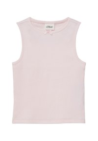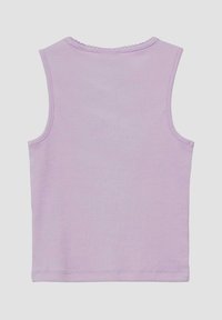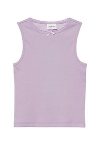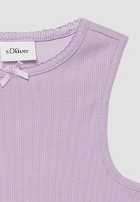 Débardeur lilas sans manches à côtes avec encolure ronde et petit nœud sous l’étiquette de la marque s.Oliver au centre devant.