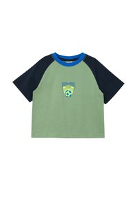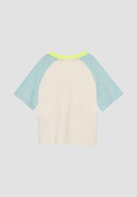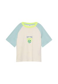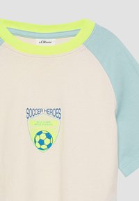T-shirt raglan beige et bleu clair à manches courtes avec encolure jaune néon et graphisme ballon de football "Soccer Heroes" sur le devant.