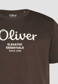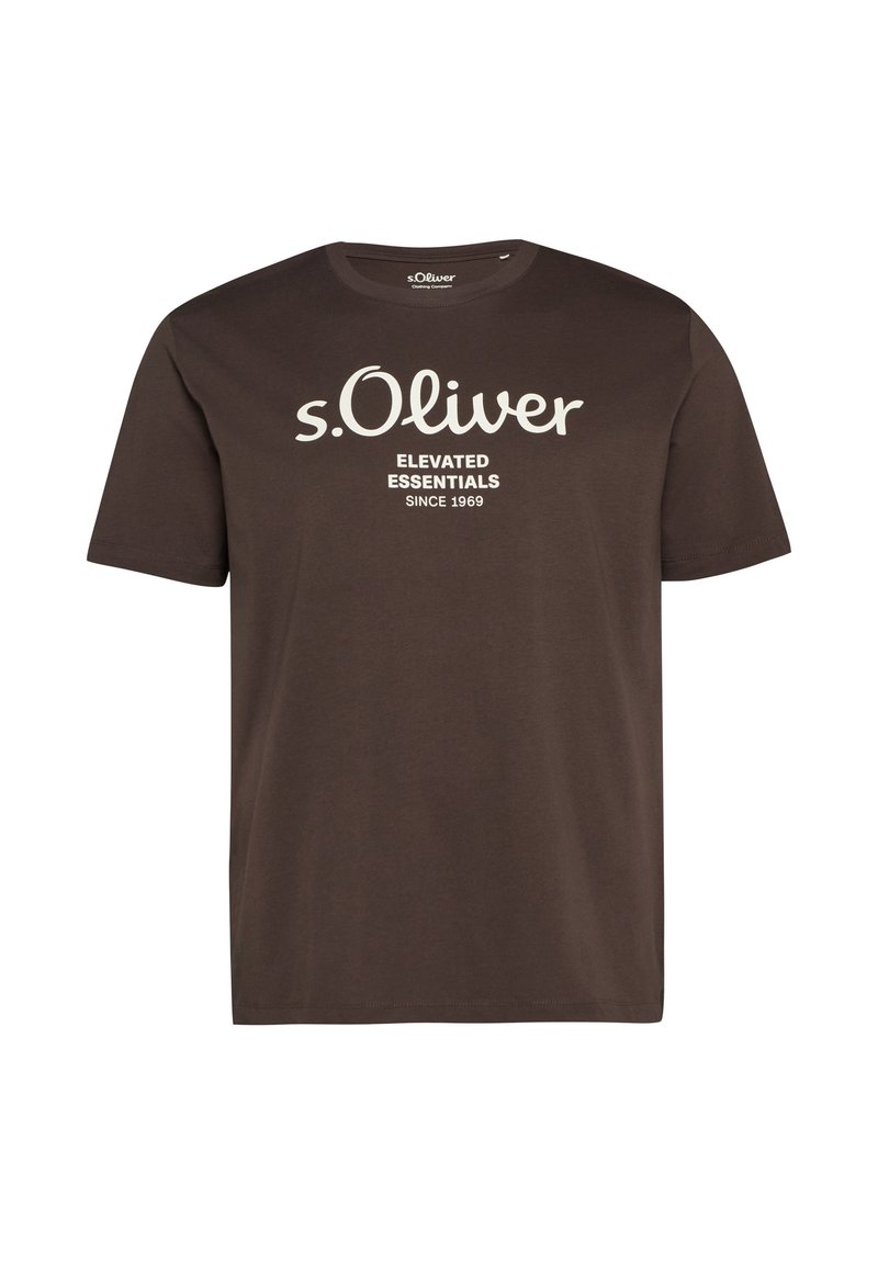 T-shirt marron à manches courtes avec texte blanc « s.Oliver ELEVATED ESSENTIALS SINCE 1969 » centré sur la poitrine.