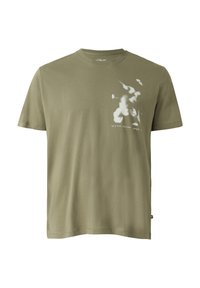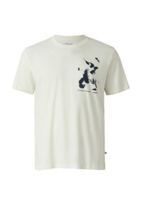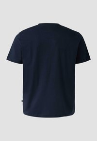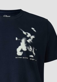 T-shirt col rond à manches courtes bleu marine avec un design abstrait blanc et un petit texte sur la partie gauche de la poitrine.