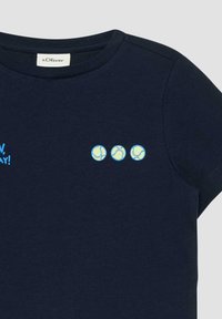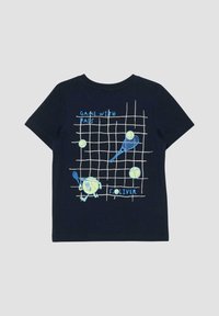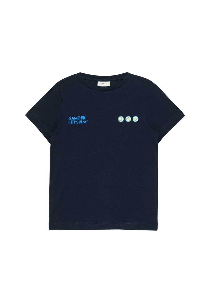 T-shirt bleu marine à manches courtes avec le texte « GAME ON, LET'S PLAY ! » et trois petites icônes de balles de tennis sur la poitrine.