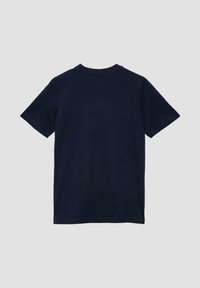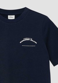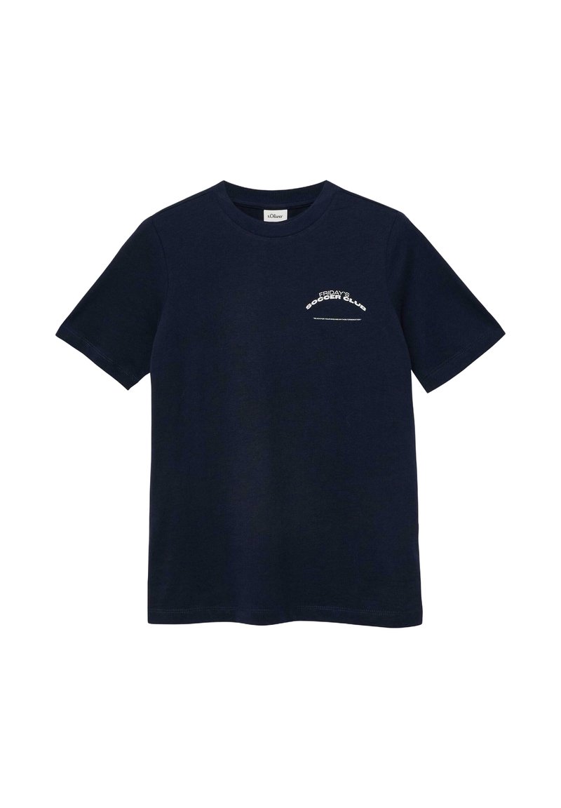 T-shirt bleu marine à manches courtes avec col rond et petit texte blanc "Friday's Soccer Club" sur la partie supérieure gauche de la poitrine.