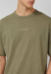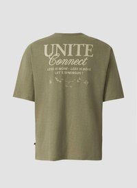 Homme de dos portant un t-shirt vert olive avec le texte « UNITE Connect » et un jean bleu, sur un fond gris uni.