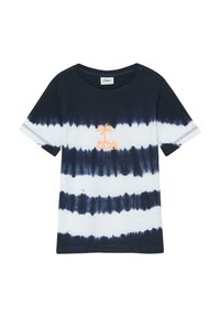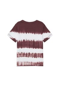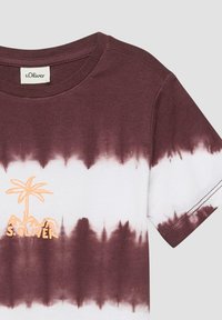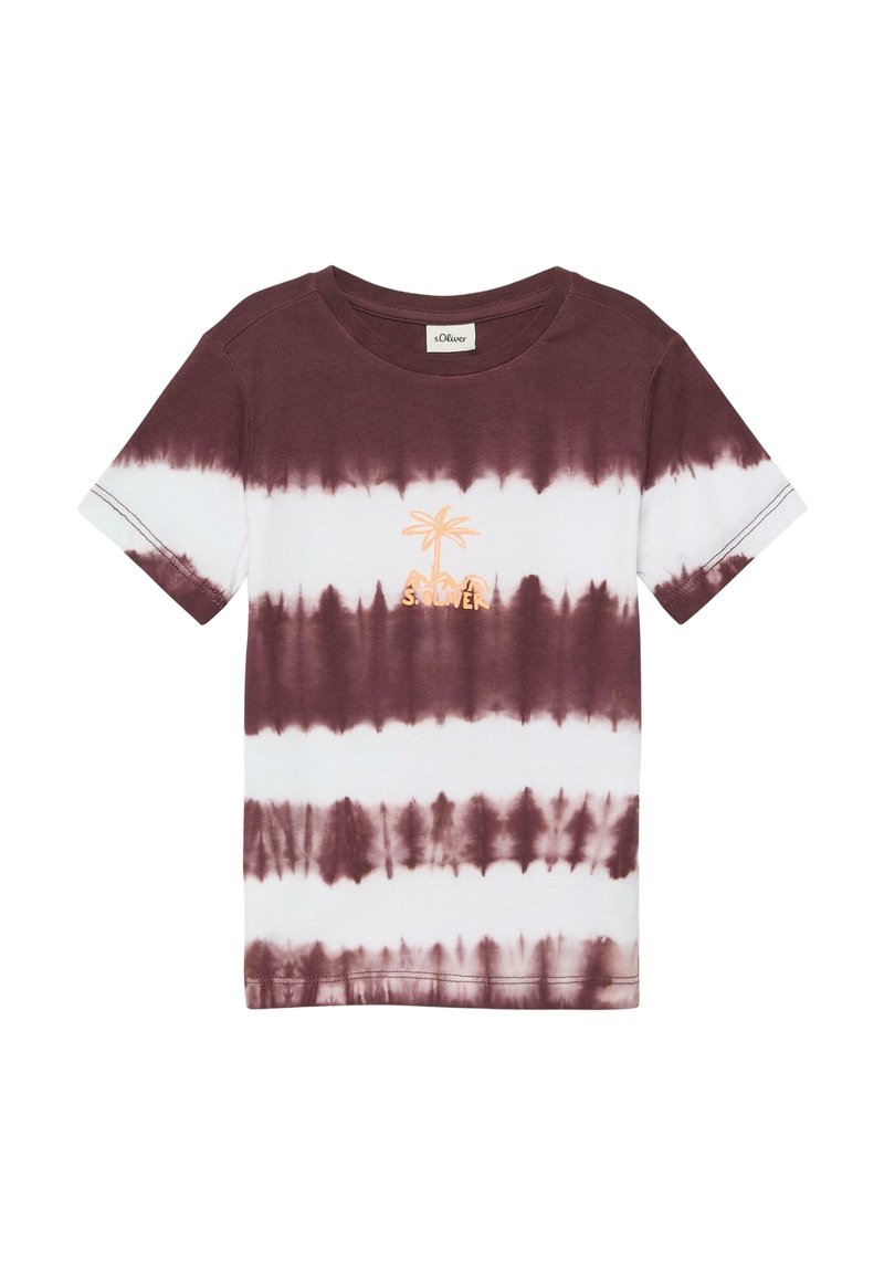 T-shirt à manches courtes tie-dye avec des rayures horizontales blanches et bordeaux, arborant un petit palmier orange et le logo « s.Oliver » sur la poitrine.