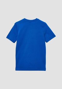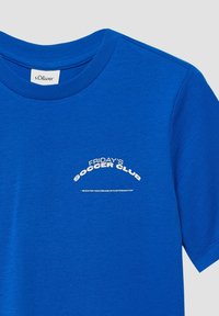 T-shirt bleu à manches courtes avec col rond, petites inscriptions blanches "Friday's Soccer Club" sur la poitrine à gauche.