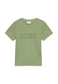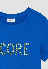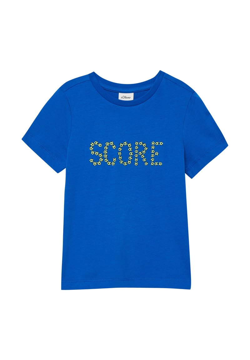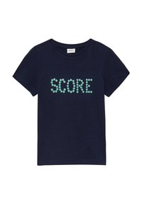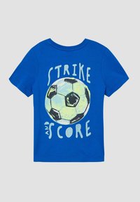 T-shirt bleu à manches courtes avec le mot « SCORE » écrit en jaune et motifs de ballons de football noirs sur la poitrine.