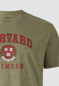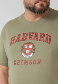 Homme barbu portant un t-shirt Harvard Crimson vert olive et un jean bleu, debout devant un fond gris clair uni.